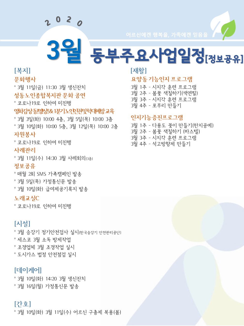 2020년 3월 동부주요사업일정 페이지 정보 작성자 최고관리자 작성일2020-03-06 10:43 조회12,458회 댓글0건 관련링크 이전글 다음글 목록 본문 댓글목록 등록된 댓글이 없습니다. 이전글 다음글 목록