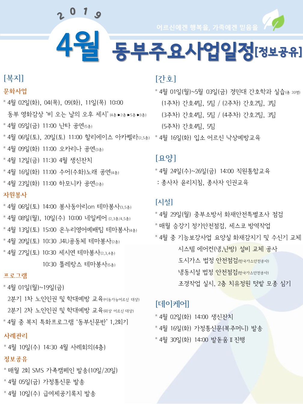 2019년 4월 동부주요사업일정 페이지 정보 작성자 최고관리자 작성일2019-03-25 16:35 조회12,253회 댓글0건 관련링크 이전글 다음글 목록 본문 추운 날씨가 끝이 나고 건강한 기운이느껴지는 좋은 계절입니다!하시는 모든 일에 봄처럼 좋은 기운만 있기를항상 응원하겠습니다 :) 댓글목록 등록된 댓글이 없습니다. 이전글 다음글 목록
