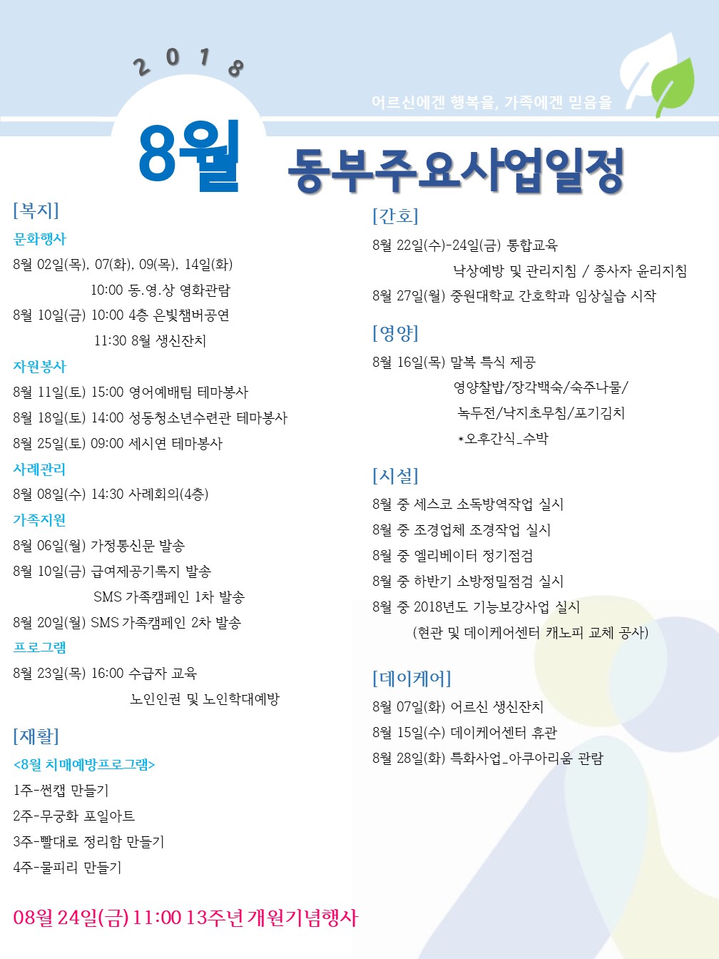 2018년 8월 주요사업 일정 페이지 정보 작성자 최고관리자 작성일2018-07-25 10:51 조회12,185회 댓글0건 관련링크 이전글 다음글 목록 본문 8월 동부 주요사업일정본격적인 휴가철이 다가옵니다:)요새 너무 더운 날씨 탓에 심신이 많이 지치고 힘드시죠~??이번 다가오는 휴가에 시원한 여행 다녀오셔서 마음의 여유와 행복을 맘껏 찾아보셨으면 합니다:) 댓글목록 등록된 댓글이 없습니다. 이전글 다음글 목록