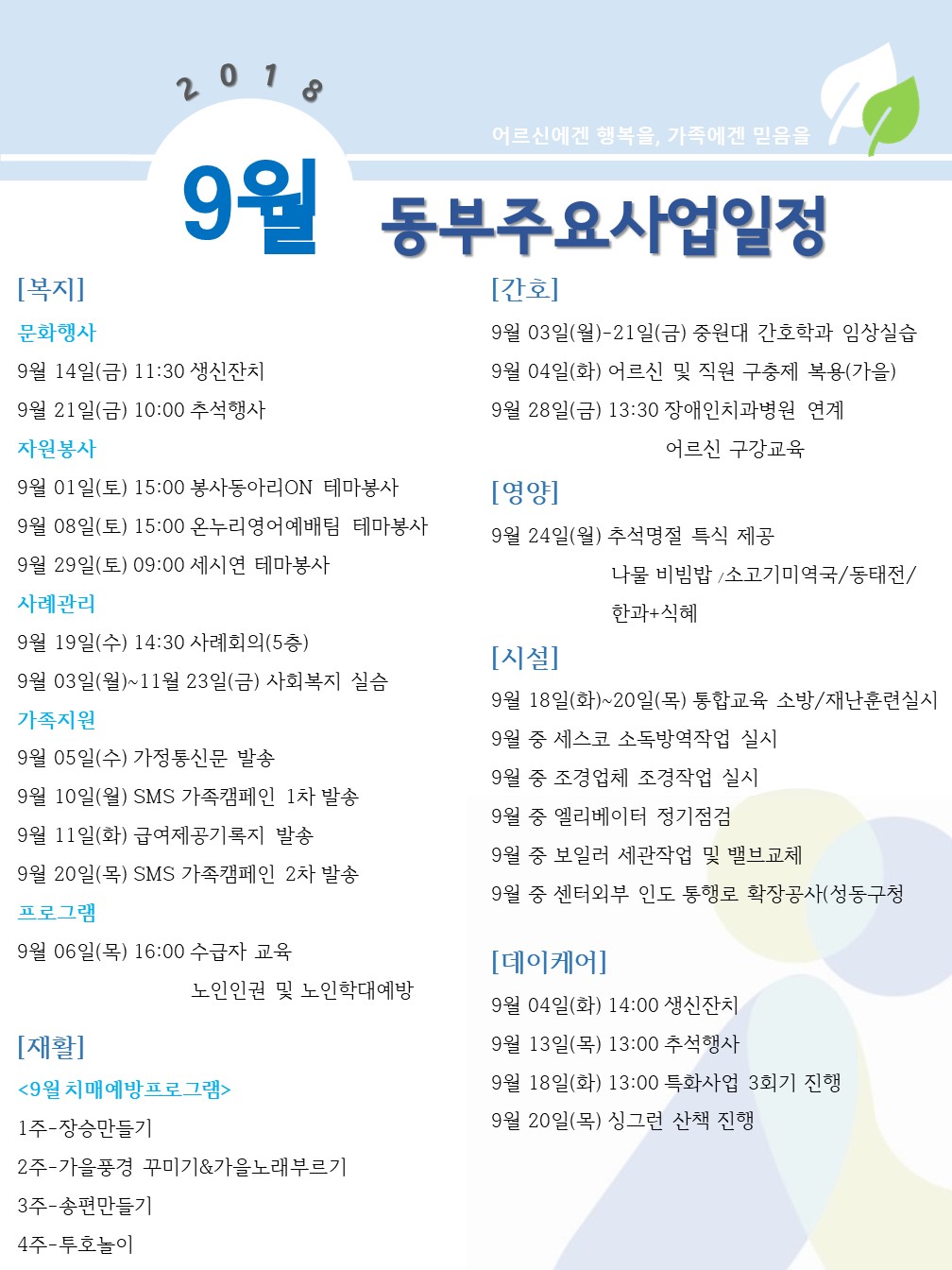 9월 주요사업일정 페이지 정보 작성자 최고관리자 작성일2018-08-30 09:41 조회12,263회 댓글0건 관련링크 이전글 다음글 목록 본문 9월 동부주요사업일정 조금씩 저녁해가 짧아지는 9월입니다여름의 끝자락이 다가오는 가을을 느끼며 행복한 한달이 되시길 바랍니다 댓글목록 등록된 댓글이 없습니다. 이전글 다음글 목록