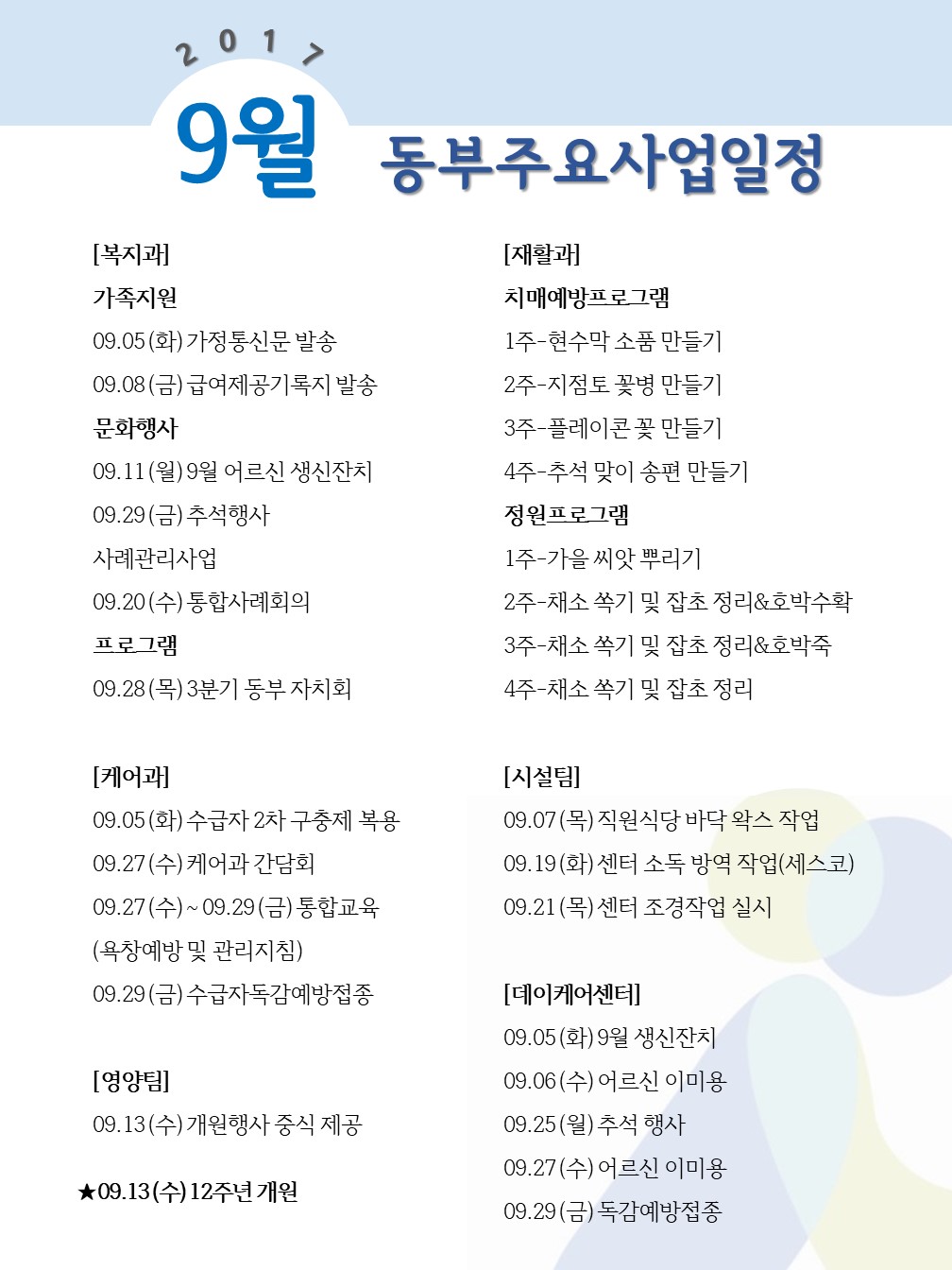 2017년도 9월 동부주요사업일정 페이지 정보 작성자 최고관리자 작성일2017-09-01 14:29 조회12,829회 댓글0건 관련링크 이전글 다음글 목록 본문 9월 동부주요사업일정입니다. 날씨가 쌀쌀해지고 있습니다. 건강관리 유의하시고 행복한 센터생활 되시길 바랍니다! 댓글목록 등록된 댓글이 없습니다. 이전글 다음글 목록