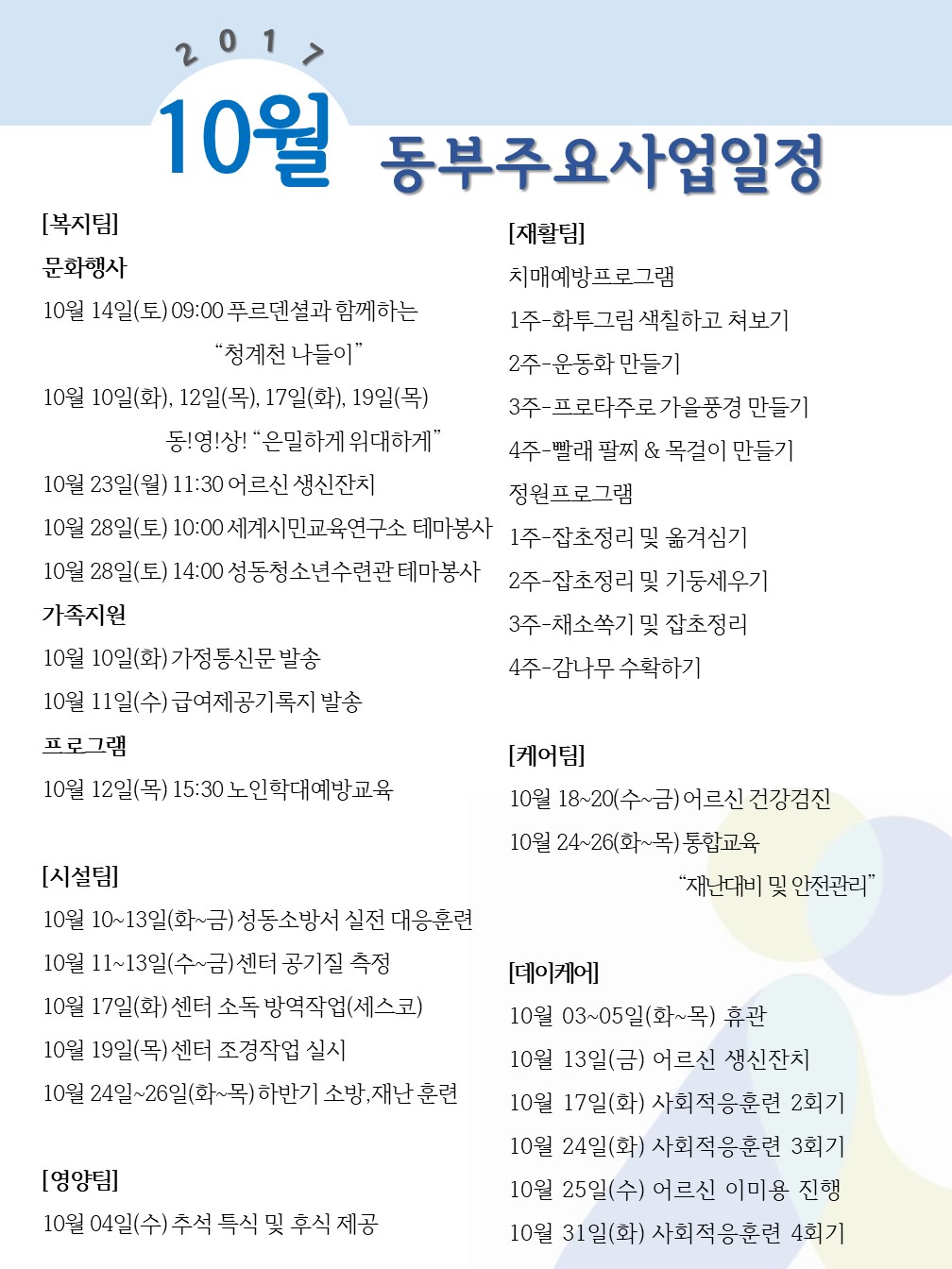 10월 동부주요사업일정 페이지 정보 작성자 최고관리자 작성일2017-09-29 17:29 조회12,721회 댓글0건 관련링크 이전글 다음글 목록 본문 10월 동부주요사업일정 입니다~ 곧 민족 대명절 추석이 다가오고 있습니다!푸르른 하늘만큼이나 풍성하고 행복한 한가위 보내세요~ 댓글목록 등록된 댓글이 없습니다. 이전글 다음글 목록