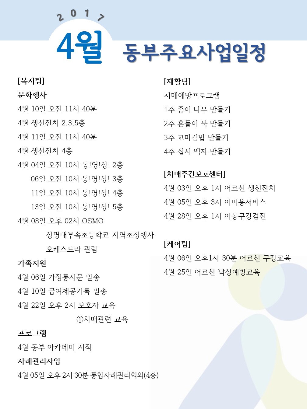 2017년 4월 동부주요사업일정 페이지 정보 작성자 최고관리자 작성일2017-03-31 09:31 조회13,163회 댓글0건 관련링크 이전글 다음글 목록 본문 2017년도 4월 동부주요사업일정입니다. 댓글목록 등록된 댓글이 없습니다. 이전글 다음글 목록