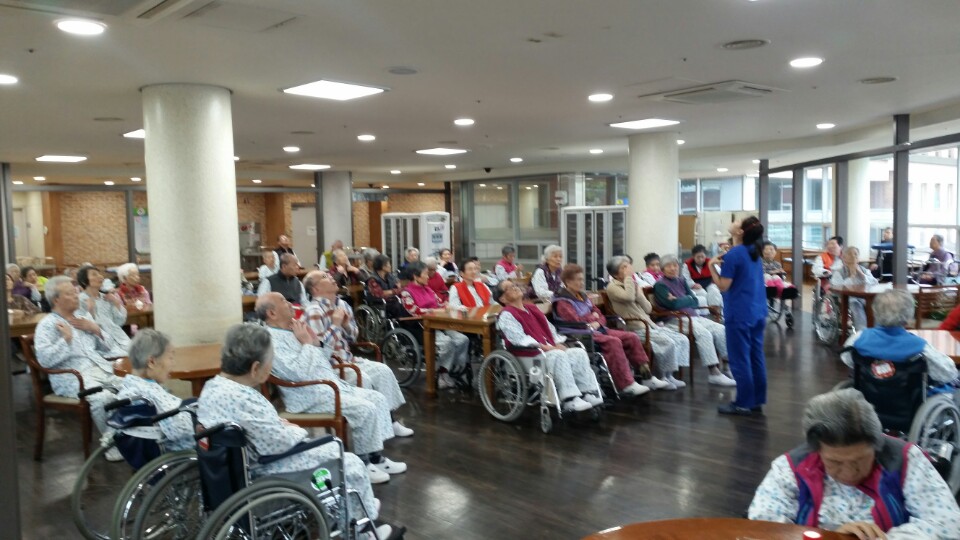 어르신들에게 인지 및 회상훈련을 통해 인지기능 유지 및 증진을 도모하고, 규칙적이고 지속적인 신체적 운동을 통해 퇴행성 질환의 악화를 방지하기 위해 각층 중앙로비에서 치료사들이 매일 인지훈련 및 치매예방체조를 진행하고 있습니다.