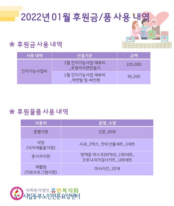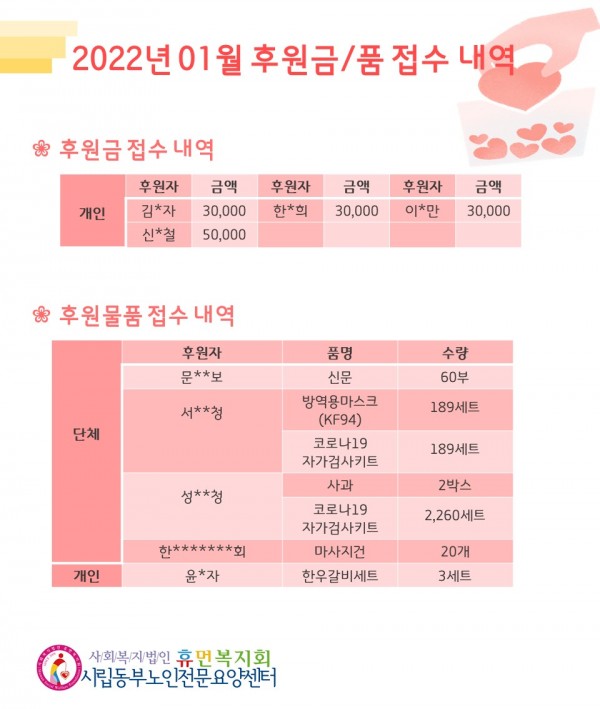 2022년 1월 후원금/품 접수내역, 사용내역 페이지 정보 작성자 최고관리자 작성일2022-02-10 18:53 조회11,991회 댓글0건 관련링크 이전글 다음글 목록 본문 1월에도 우리 센터에 관심과 사랑을 베풀어주셔서 감사합니다.추워지는 계절에 감기 조심하시고, 새해 복 많이 받으시기 바랍니다.2022년 2월에도 많은 사랑과 관심 부탁드립니다. 댓글목록 등록된 댓글이 없습니다. 이전글 다음글 목록