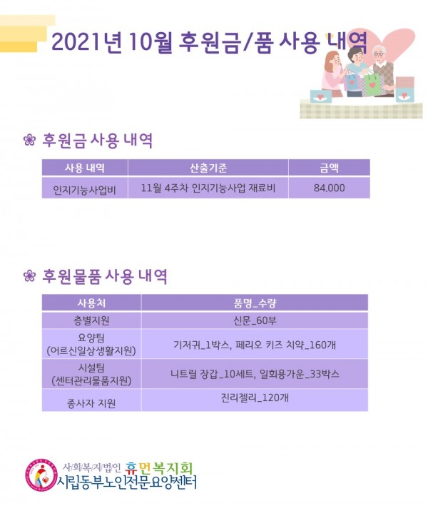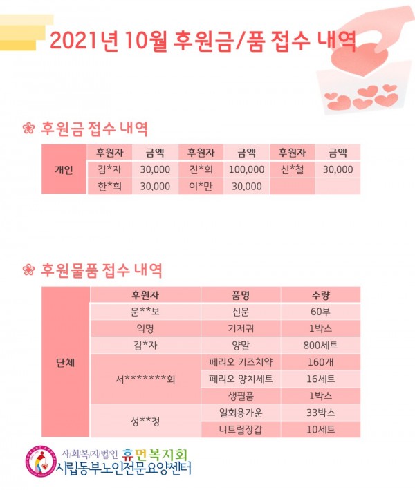 2021년 10월 후원금/품 접수내역, 사용내역 페이지 정보 작성자 최고관리자 작성일2021-11-05 17:57 조회12,108회 댓글0건 관련링크 이전글 다음글 목록 본문 10월에도 우리 센터에 관심과 사랑을 베풀어주셔서 감사합니다.쌀쌀해진 날씨, 감기와 코로나 조심하시고 11월에도 많은 사랑 부탁드립니다. 댓글목록 등록된 댓글이 없습니다. 이전글 다음글 목록