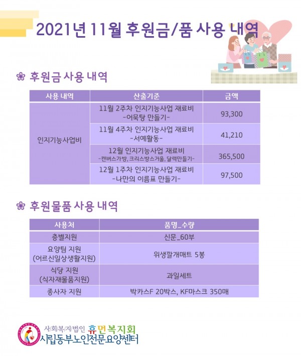 2021년 11월 후원금/품 접수내역, 사용내역 페이지 정보 작성자 최고관리자 작성일2021-12-07 10:48 조회12,253회 댓글0건 관련링크 이전글 다음글 목록 본문 11월에도 우리 센터에 관심과 사랑을 베풀어주셔서 감사합니다.성큼 다가온 겨울 추위에 감기와 코로나 조심하시고, 12월에도 많은 사랑 부탁드립니다. 댓글목록 등록된 댓글이 없습니다. 이전글 다음글 목록