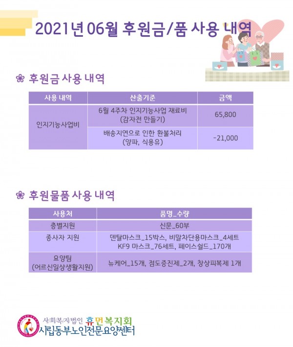 2021년 6월 후원금/품 접수내역, 사용내역 페이지 정보 작성자 최고관리자 작성일2021-07-12 11:12 조회12,415회 댓글0건 관련링크 이전글 다음글 목록 본문 무더운 여름이 시작되었습니다. 더위 속에서 모두 힘내시고 6월 한달 동안 많은 관심과 사랑의 손길을 베풀어 주셔서 감사합니다.7월에도 많은 관심과 사랑을 부탁 드립니다. :) 댓글목록 등록된 댓글이 없습니다. 이전글 다음글 목록