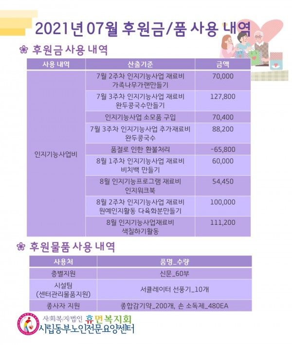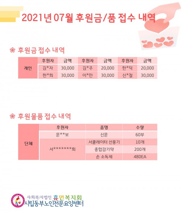2021년 7월 후원금/품 접수내역, 사용내역 페이지 정보 작성자 최고관리자 작성일2021-08-04 18:35 조회12,241회 댓글0건 관련링크 이전글 다음글 목록 본문 무더운 여름 속 더위 조심하시고, 7월에 감사의 손길을 보내주신 모든 후원자님께 감사의 인사 드립니다.8월에도 많은 관심과 사랑 부탁드립니다:) 댓글목록 등록된 댓글이 없습니다. 이전글 다음글 목록