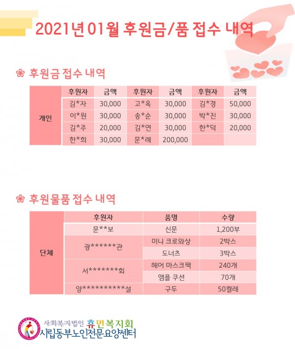 2021년 1월 후원금/품 접수내역, 사용내역 페이지 정보 작성자 최고관리자 작성일2021-02-04 08:14 조회12,714회 댓글0건 관련링크 이전글 다음글 목록 본문 2021년 신축년의 해가 밝았습니다! 2021년에는 모두 건강하시고, 하는 일 잘 될 수 있도록 기도드리겠습니다:-)2월에도 많은 관심과 후원 부탁드립니다. 댓글목록 등록된 댓글이 없습니다. 이전글 다음글 목록