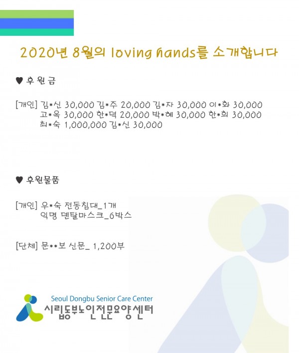 2020년 8월 loving hands!!를 소개합니다. 페이지 정보 작성자 최고관리자 작성일2020-09-07 08:57 조회13,162회 댓글0건 관련링크 이전글 다음글 목록 본문 코로나19라는 어려움 속에서도 많은 관심과 사랑을 주셔서 감사합니다.가을의 시원함이 성큼 다가온 것 같은 9월이 되었습니다.9월에도 많은 사랑 부탁드립니다:) 댓글목록 등록된 댓글이 없습니다. 이전글 다음글 목록