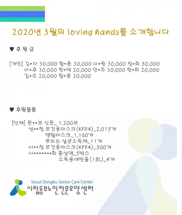 2020년 3월 loving hands!!를 소개합니다. 페이지 정보 작성자 최고관리자 작성일2020-04-06 08:05 조회13,481회 댓글0건 관련링크 이전글 다음글 목록 본문 3월 시립동부노인전문요양센터에 후원해주신 모든 분들께 많은 감사의 인사를 전해드립니다.만개한 벚꽃처럼 아름다운 날들 보내시고, 4월에도 많은 관심과 사랑 부탁드립니다. 댓글목록 등록된 댓글이 없습니다. 이전글 다음글 목록