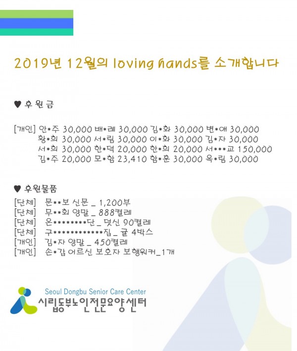 2019년 12월 loving hands!!를 소개합니다. 페이지 정보 작성자 최고관리자 작성일2020-01-06 10:15 조회14,084회 댓글0건 관련링크 이전글 다음글 목록 본문 2020년 새해가 밝았습니다! 모두 옷 따뜻하게 입으시고 감기 조심하세요~2020년 새해에도 모두 행복한 일들이 가득하길 기도하겠습니다! 댓글목록 등록된 댓글이 없습니다. 이전글 다음글 목록