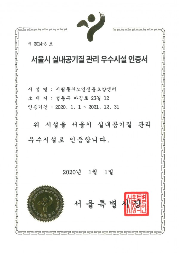 우리 센터가 서울시로 부터 실내공기질 관리 우수시설로 선정되었습니다. (3월 인증서 수령)