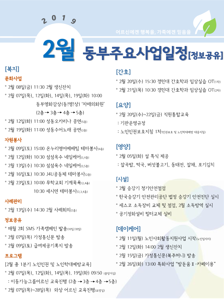 2019년 2월 동부주요사업일정 페이지 정보 작성자 최고관리자 작성일2019-01-28 15:12 조회12,318회 댓글0건 관련링크 이전글 다음글 목록 본문 2019년 새해를 맞이 한지 엊그제 같은데 벌써 2월이 다가옵니다^^새롭게 맞이하는 2월은 행복하고 기분좋은 일들만 가득하길 바래봅니다♥ 댓글목록 등록된 댓글이 없습니다. 이전글 다음글 목록