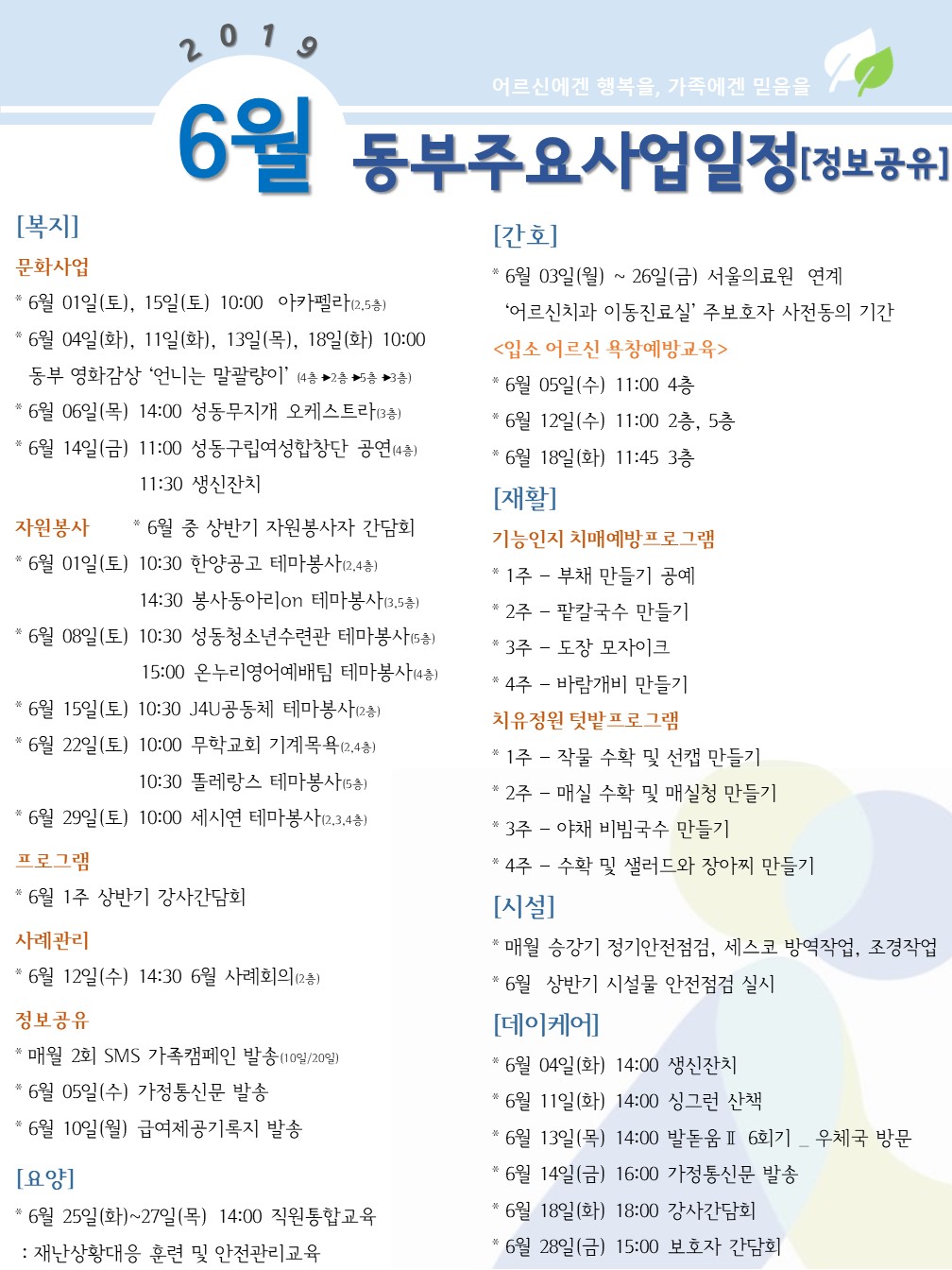 2019년 6월 동부주요사업일정 페이지 정보 작성자 최고관리자 작성일2019-05-29 17:25 조회12,132회 댓글0건 관련링크 이전글 다음글 목록 본문 댓글목록 등록된 댓글이 없습니다. 이전글 다음글 목록
