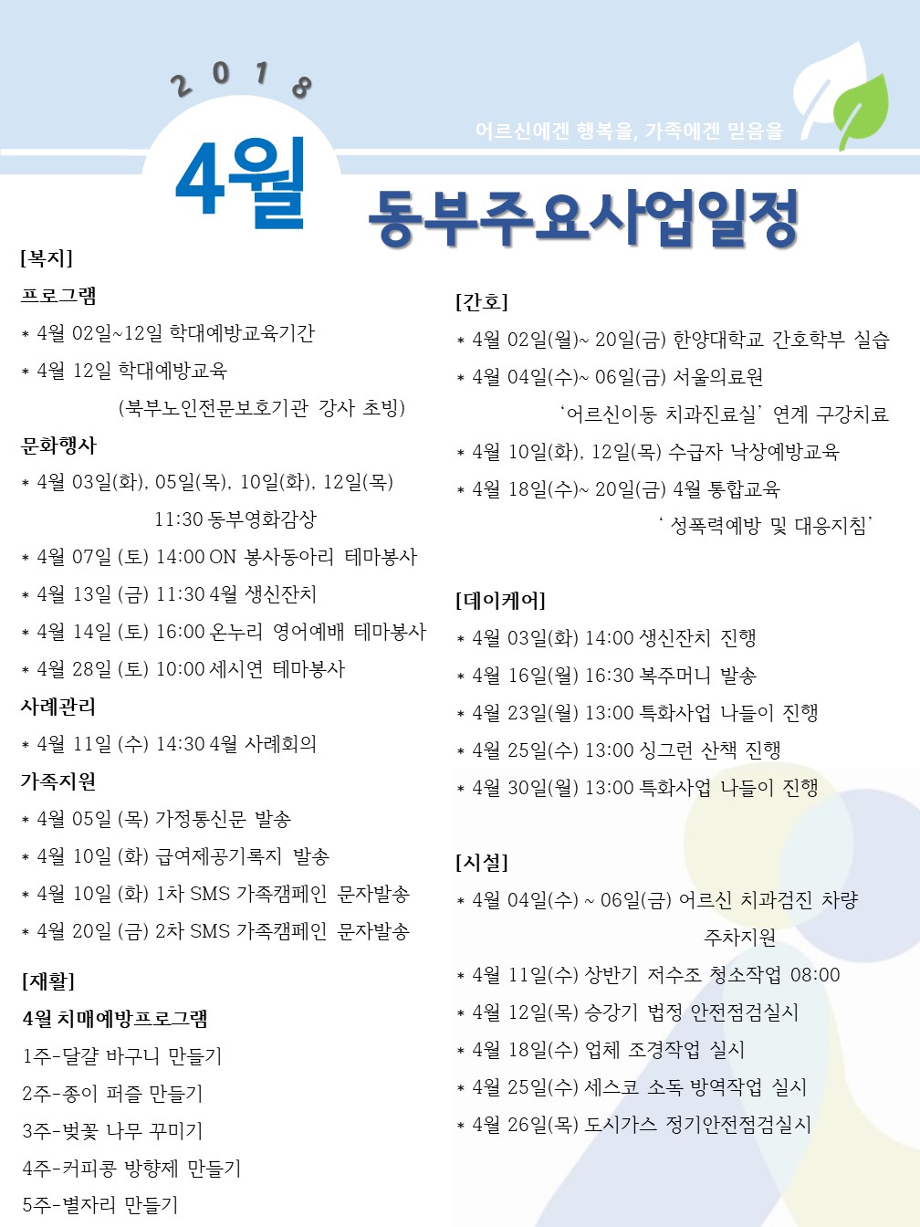 2018년 4월 동부주요사업일정 페이지 정보 작성자 최고관리자 작성일2018-03-30 09:25 조회12,269회 댓글0건 관련링크 이전글 다음글 목록 본문 4월 동부주요사업일정입니다. 참고바랍니다. 날이 따뜻해지고 푸르른 새싹들이 자라나는 4월미세먼지와 황사가 많은데 건강 주의하시고, 행복하고 따뜻한 하루 보내세요~~ 댓글목록 등록된 댓글이 없습니다. 이전글 다음글 목록