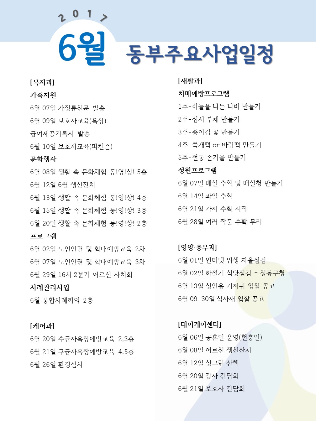 2017년 6월 동부주요사업일정 페이지 정보 작성자 최고관리자 작성일2017-05-31 16:03 조회12,606회 댓글0건 관련링크 이전글 다음글 목록 본문 2017년도 6월 동부 주요사업일정입니다.날씨가 더워지고 있습니다. 동부가족들 모두 건강관리 유의하세요~ 댓글목록 등록된 댓글이 없습니다. 이전글 다음글 목록