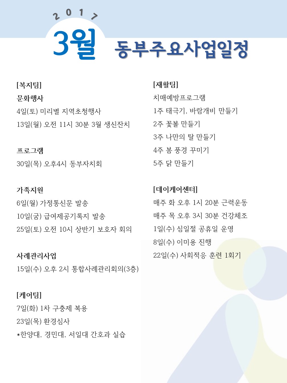2017년 3월 동부주요사업일정 페이지 정보 작성자 최고관리자 작성일2017-02-28 17:22 조회12,936회 댓글0건 관련링크 이전글 다음글 목록 본문 3월 동부 주요사업 일정입니다.꽃 피는 봄 동부가족 여러분 모두 행복하세요♥ 댓글목록 등록된 댓글이 없습니다. 이전글 다음글 목록