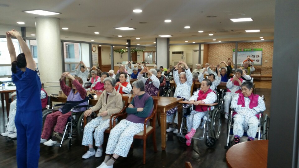 어르신들에게 인지 및 회상훈련을 통해 인지기능 유지 및 증진을 도모하고, 규칙적이고 지속적인 신체적 운동을 통해 퇴행성 질환의 악화를 방지하기 위해 각층 중앙로비에서 치료사들이 매일 인지훈련 및 치매예방체조를 진행하고 있습니다.