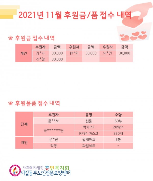 2021년 11월 후원금/품 접수내역, 사용내역 페이지 정보 작성자 최고관리자 작성일2021-12-07 10:48 조회12,253회 댓글0건 관련링크 이전글 다음글 목록 본문 11월에도 우리 센터에 관심과 사랑을 베풀어주셔서 감사합니다.성큼 다가온 겨울 추위에 감기와 코로나 조심하시고, 12월에도 많은 사랑 부탁드립니다. 댓글목록 등록된 댓글이 없습니다. 이전글 다음글 목록