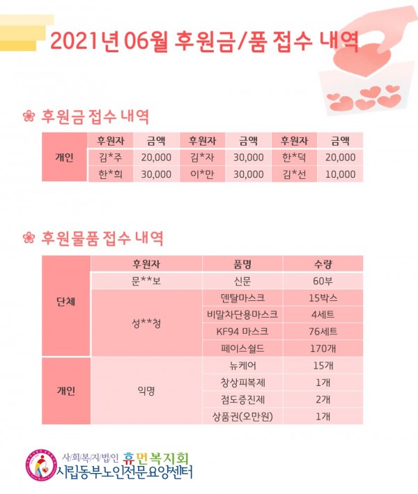 2021년 6월 후원금/품 접수내역, 사용내역 페이지 정보 작성자 최고관리자 작성일2021-07-12 11:12 조회12,415회 댓글0건 관련링크 이전글 다음글 목록 본문 무더운 여름이 시작되었습니다. 더위 속에서 모두 힘내시고 6월 한달 동안 많은 관심과 사랑의 손길을 베풀어 주셔서 감사합니다.7월에도 많은 관심과 사랑을 부탁 드립니다. :) 댓글목록 등록된 댓글이 없습니다. 이전글 다음글 목록