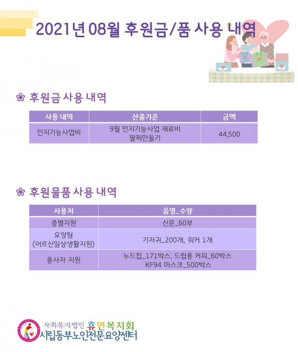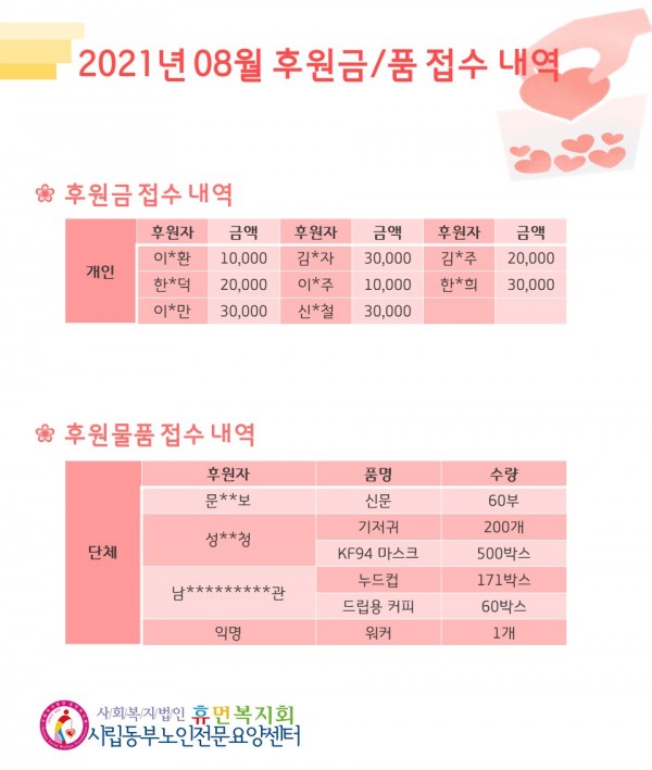 2021년 8월 후원금/품 접수내역, 사용내역 페이지 정보 작성자 최고관리자 작성일2021-09-06 10:35 조회12,086회 댓글0건 관련링크 이전글 다음글 목록 본문 무더웠던 여름 8월에 우리 기관에 많은 관심과 사랑을 베풀어주셔서 감사드립니다.9월에도 많은 사랑 부탁드립니다:) 댓글목록 등록된 댓글이 없습니다. 이전글 다음글 목록