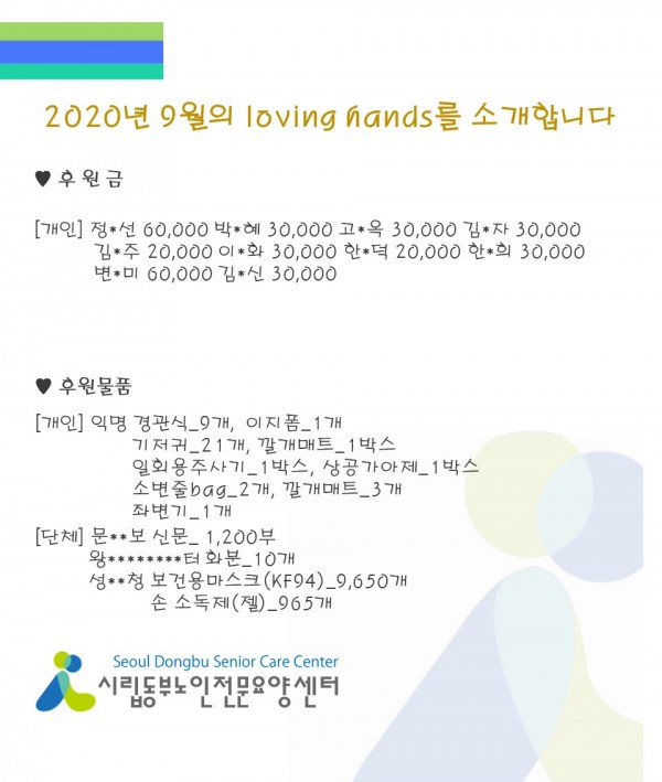 2020년 9월 loving hands!!를 소개합니다. 페이지 정보 작성자 최고관리자 작성일2020-10-06 11:49 조회12,981회 댓글0건 관련링크 이전글 다음글 목록 본문 성큼 다가온 계절, 가을이 돌아왔습니다.모두 추석 한가위 잘 보내셨는지요? 항상 행복한 일 가득하시고10월에도 많은 관심과 사랑의 손길을 베풀어주세요!^^ 감사합니다:) 댓글목록 등록된 댓글이 없습니다. 이전글 다음글 목록