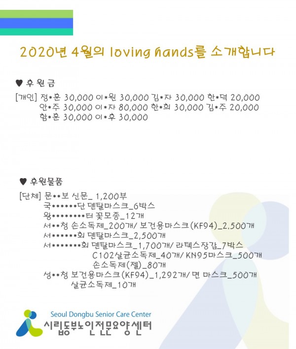 2020년 4월 loving hands!!를 소개합니다. 페이지 정보 작성자 최고관리자 작성일2020-05-06 18:35 조회13,235회 댓글0건 관련링크 이전글 다음글 목록 본문 4월 시립동부노인전문요양센터에 후원해주신 모든 분들께 많은 감사의 인사를 전해드립니다.성큼 무더운 여름의 날씨가 다가오고 있습니다. 일교차로 인해 감기 조심하시고 5월에도 많은 관심과 사랑 부탁드립니다. 댓글목록 등록된 댓글이 없습니다. 이전글 다음글 목록